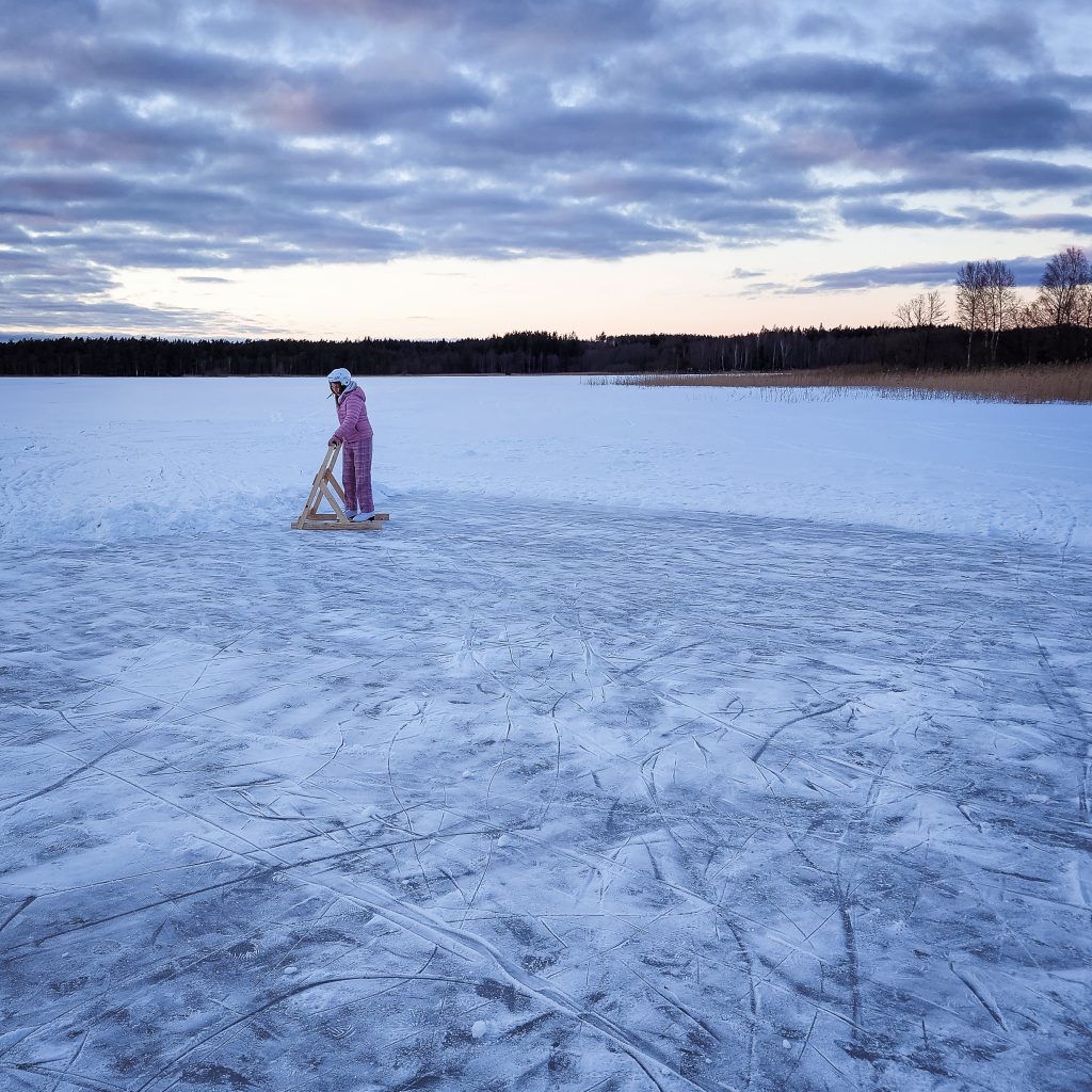 Izzy skating on the frozen Helgasjön using the home made skating aid.