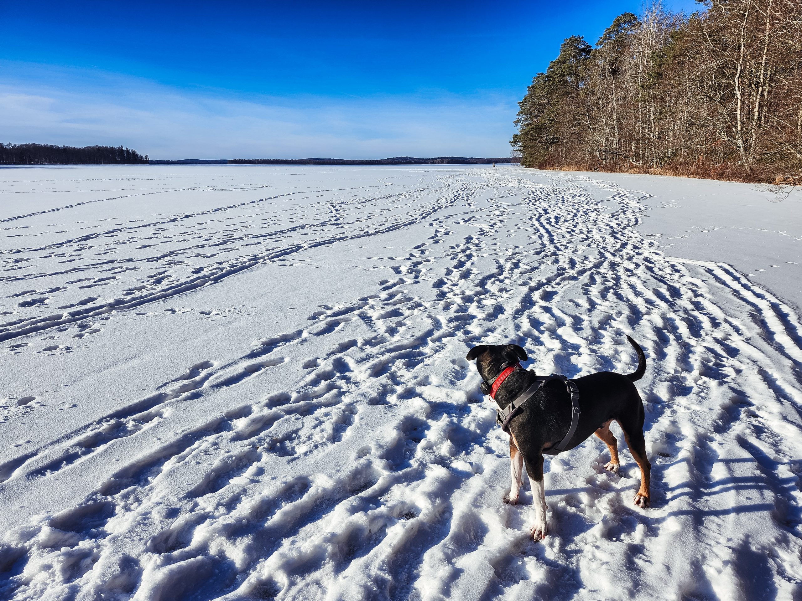 Hoagie enjoying some freedom on Helgasjön. We were not the first group to walk that stretch of lake.Helgasjön, late afternoon.Walking back to the car late afternoon at Helgö Naturreservat