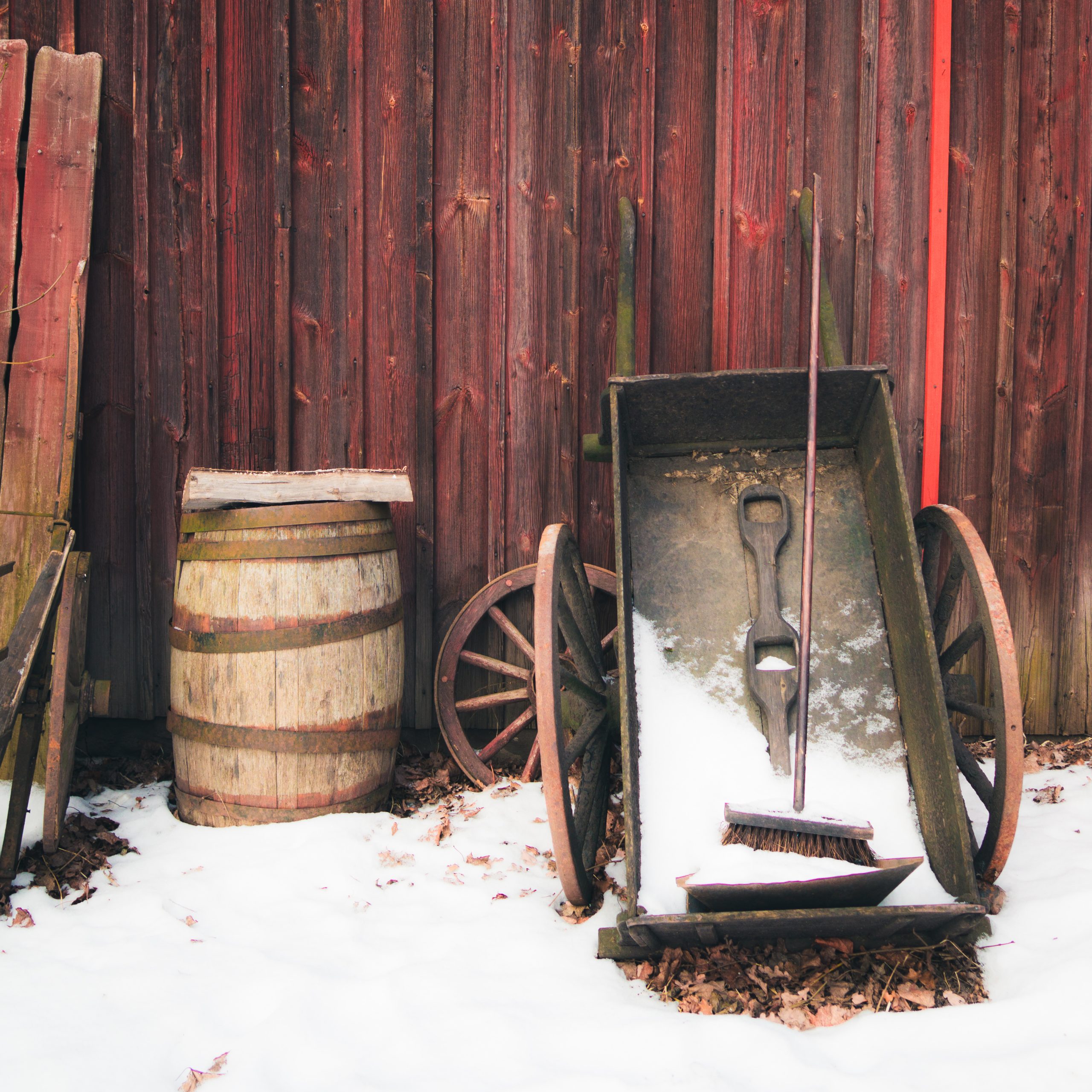 Foggy morning walk in Växjö. Our apartment buildings are shrouded in the distance.Shed in Växjö. The snow is mostly melted.