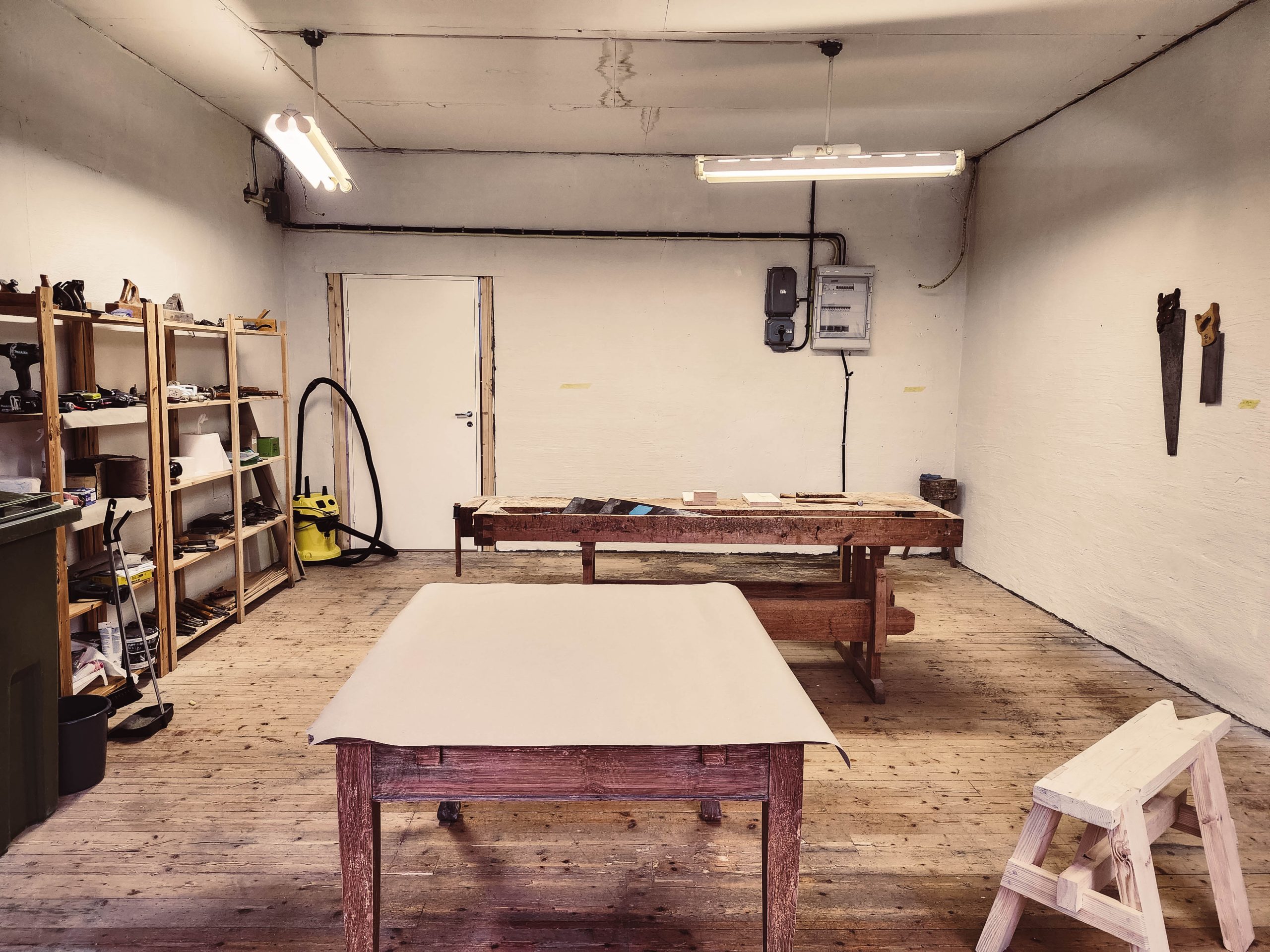 My workshop is coming together. I have the walls painted and have started organizing. The landlord has a lot of old hand tools and some workbenches they are letting me use while I rent the space, which will help a lot. I’m still waiting on the electrician to replace the lights and add some outlets on the wall. The bathroom that is off the back of my workshop will be closed off (and opened to another space in the building), which will give me more wall space in the workshop, but a slightly longer walk to the bathroom. Overall I think I’m in pretty good shape. Tomorrow I’ll bring some of my tools over and start working on making a Danish Cord Bench from Oak (assuming I can grab some oak tomorrow am).