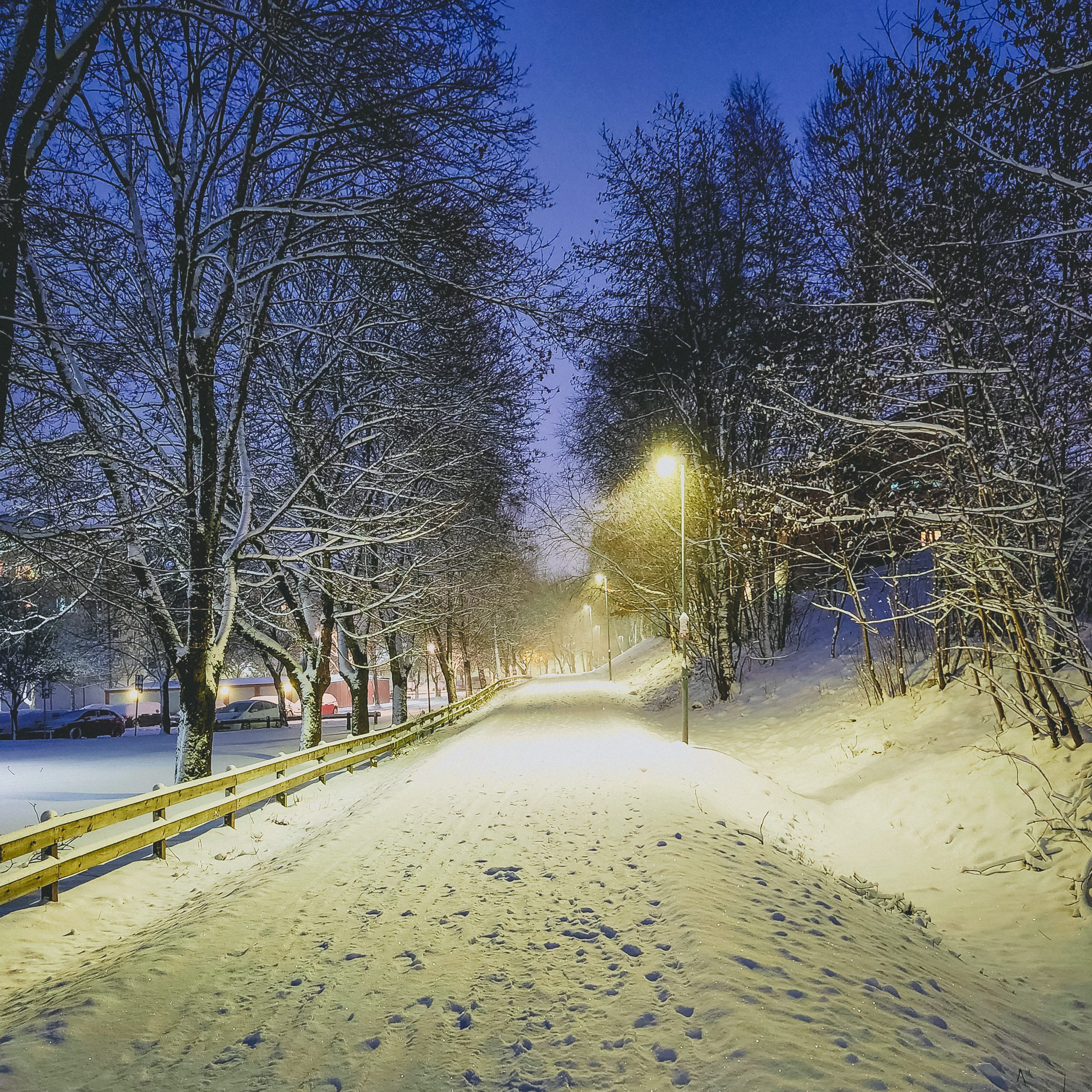 Walking home from the grocery store in the snow. Not a good day for biking, though I did see a handful of people riding in the snow (Växjö Sweden).