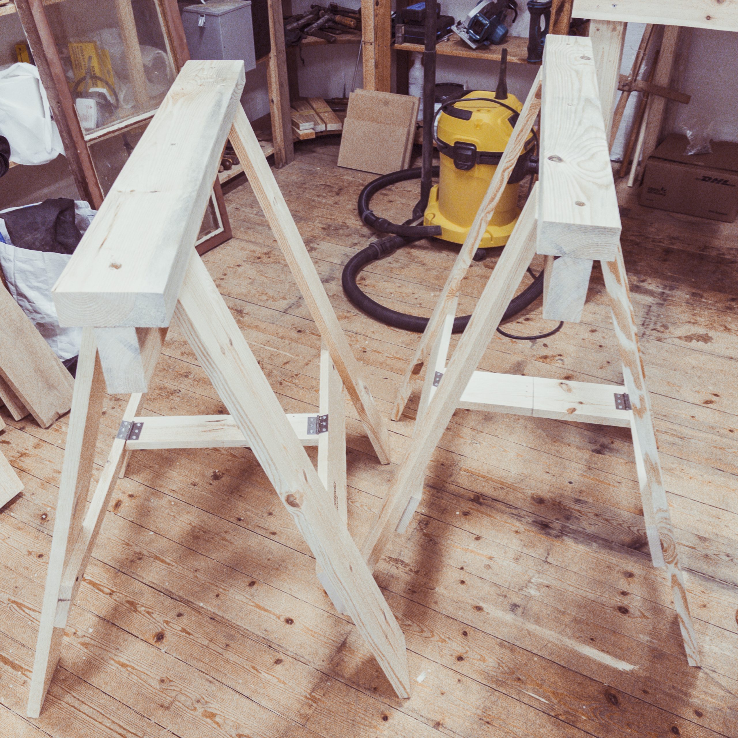 My next project will be building a chicken coop (hönshus) for the Norlandia preschool in Hovmantorp. It won’t be furniture, but it will help pay for the workshop. I needed sawhorses for the project (and they are useful to have around). I did a search around the web and decided to build a set of folding sawhorses that will easily fit in the car. I finished assembling the second sawhorse this morning before heading home to meet Izzy after school.