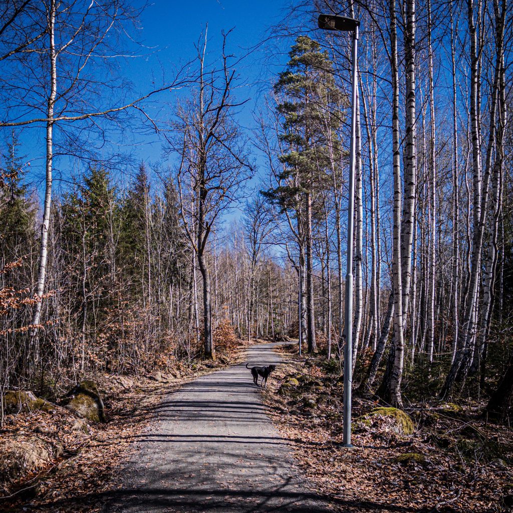 We are starting to get some spring-like weather here between the stretches of Sweden-winter-like weather (i.e. cold, overcast and wet). Today was one of them. There is a 2-mile loop from my workshop that takes me around a mile-long lighted running/walking/biking path (Löpanäs elljusspår) through the Rottne countryside and down by lake Innaren. It gets Hoagie and I out for a little over a half-hour and breaks up the day. It hasn’t been too busy during lunch-time which allows me to let Hoagie run a little bit.