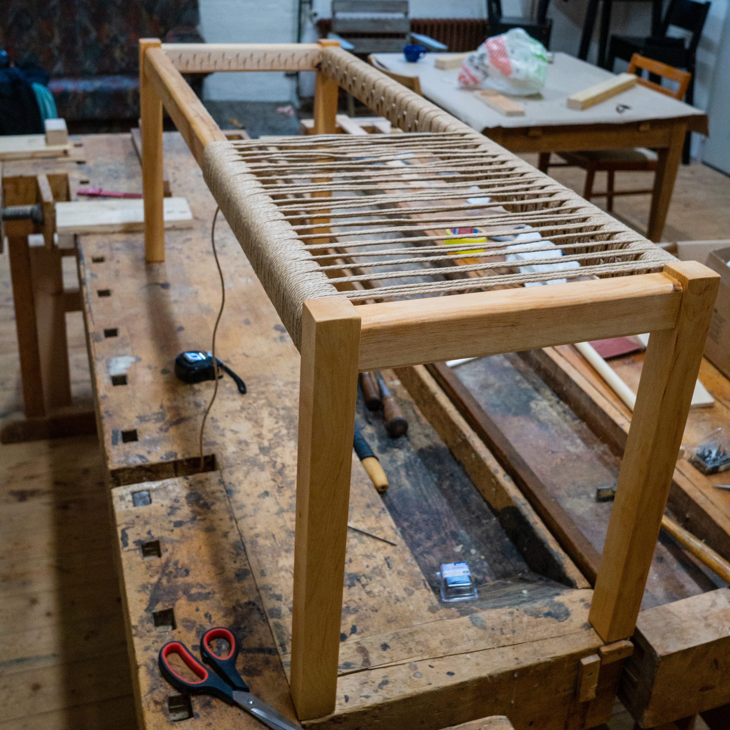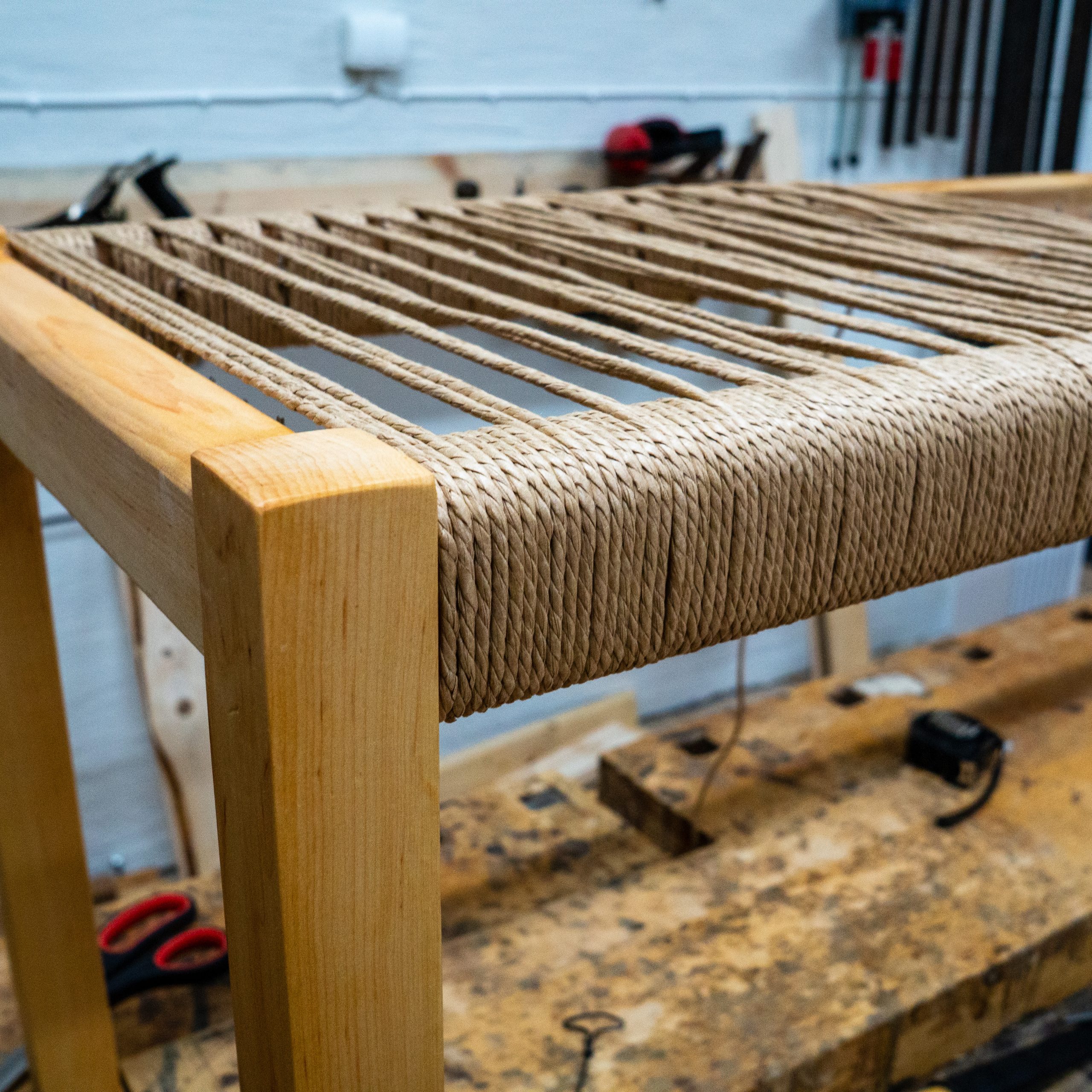 I’m in the homestretch with my bench build. I put finish on the legs over the weekend and started weaving the top this morning. This is my first time weaving, so it is a bit slow going, and I think the warp is the easy part of the weave. The next step (the weft) is the real challenge to make the top look good.